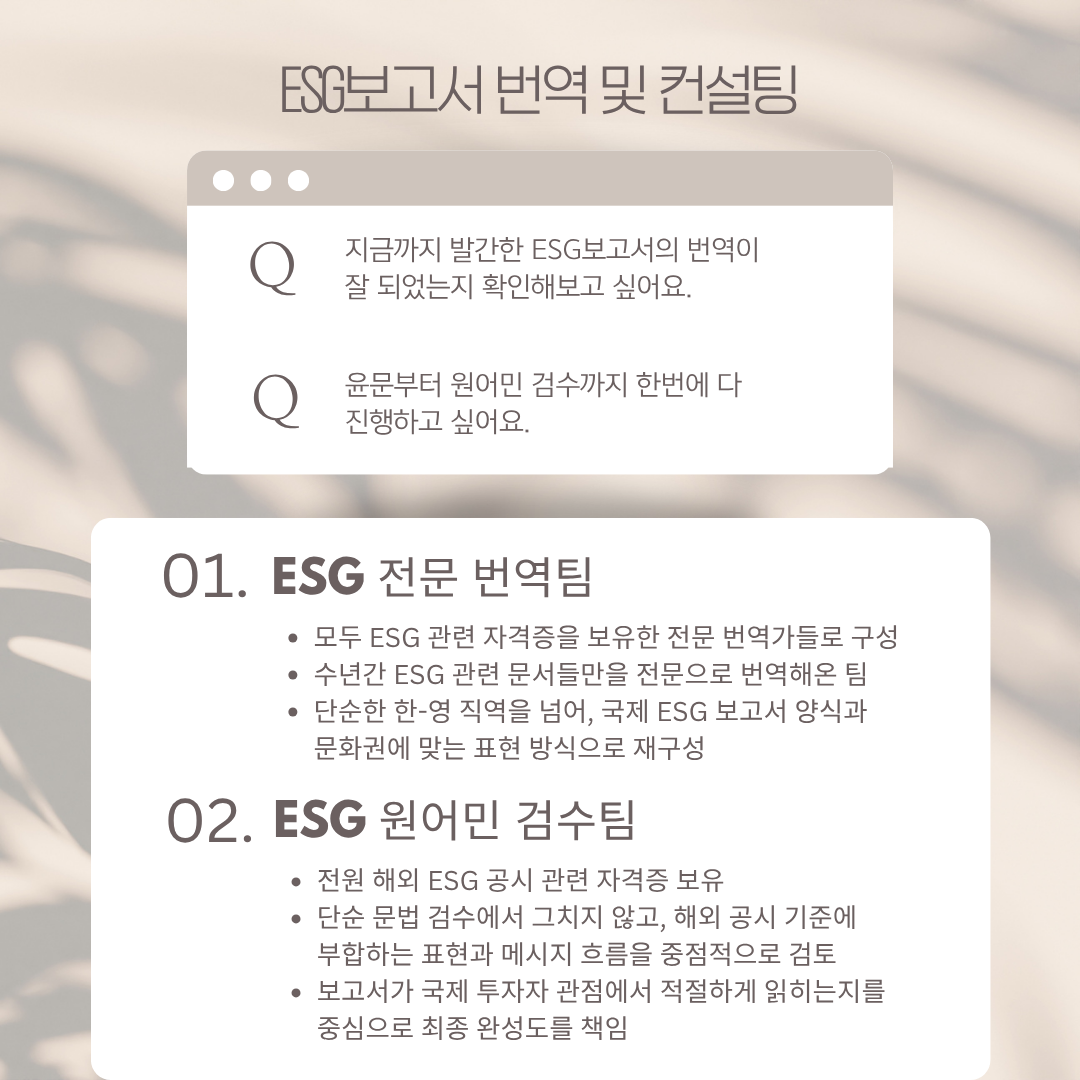 ESG 전문가와 번역 전문가가 협력하여 전문 리뷰와 검수를 통한 품질 포장
